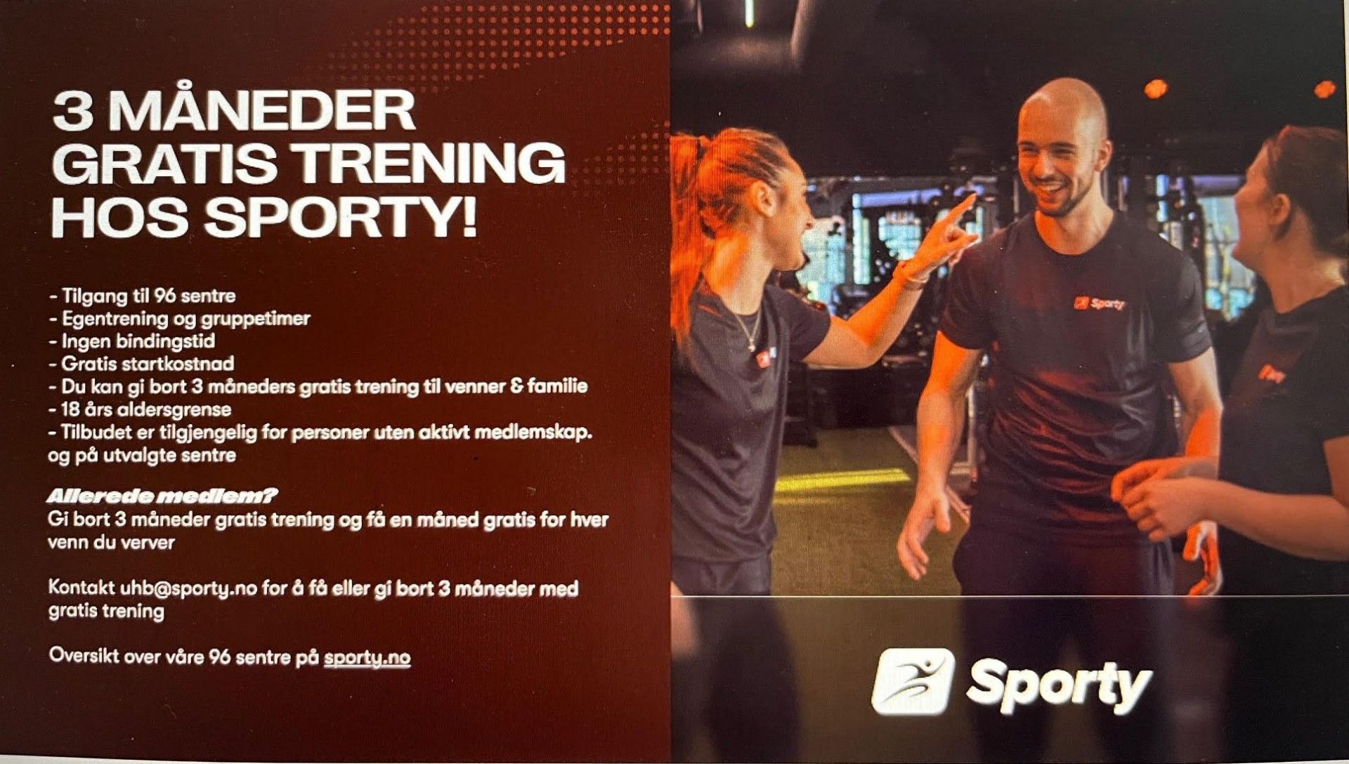 3 måneders gratis trening – helt uten bindingstidVi har en gladnyhet. For å fremme trivsel og god helse har vi inngått en avtale med treningskjeden SPORTY,