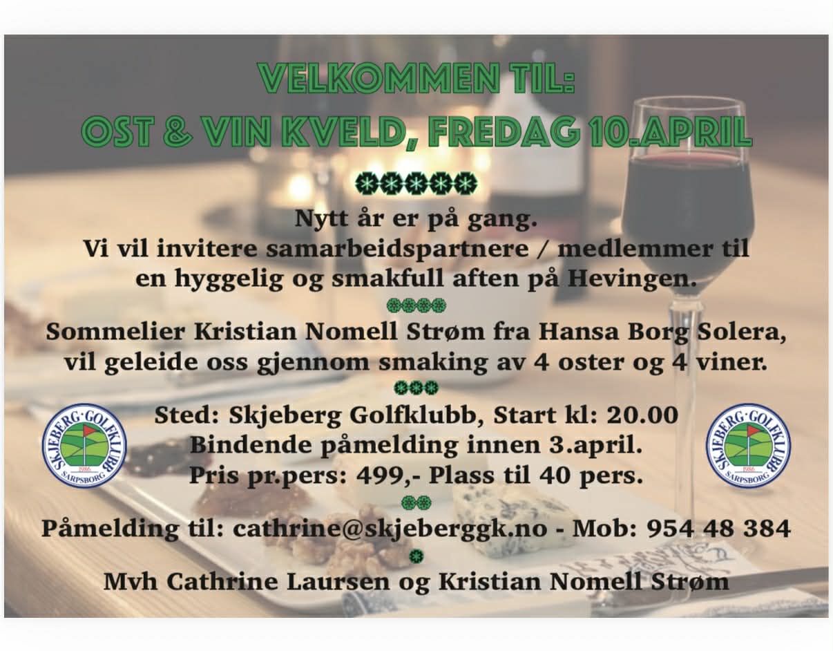 Her er det ingen grunn til å vente om du vil ha en uforglemmelig aften med ost & vin på Skjeberg Golfklubb.Bare å holde av fredagskvelden den 10. april og vende nesa mot klubbhuset vårt.