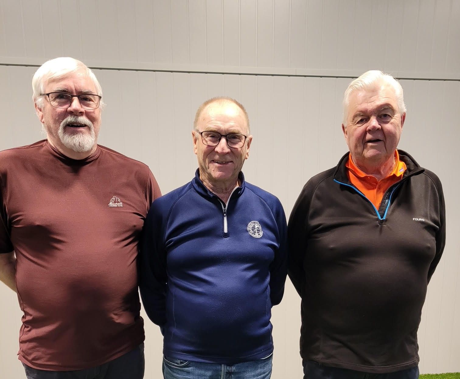 Bildet: Oddvar Kjøs i midten vant, foran Åge Helle tilvenstre og pallspesialisten Ragnar Svartdal.Oddvar Kjøs vant seniorturneringen mandag 16. februar i simulatorsenteret til Skjeberg Golfklubb. Det var 13 spillere som hadde tatt turen mandag.